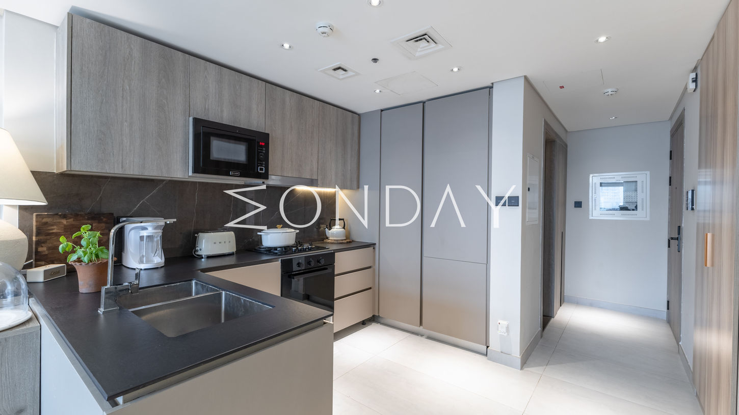 The layout offers 768 SQFT of well-designed space, featuring a modern interior, two bathrooms, and a fully equipped kitchen finished to a high standard. Large windows and smart design elements create a bright, comfortable living environment.